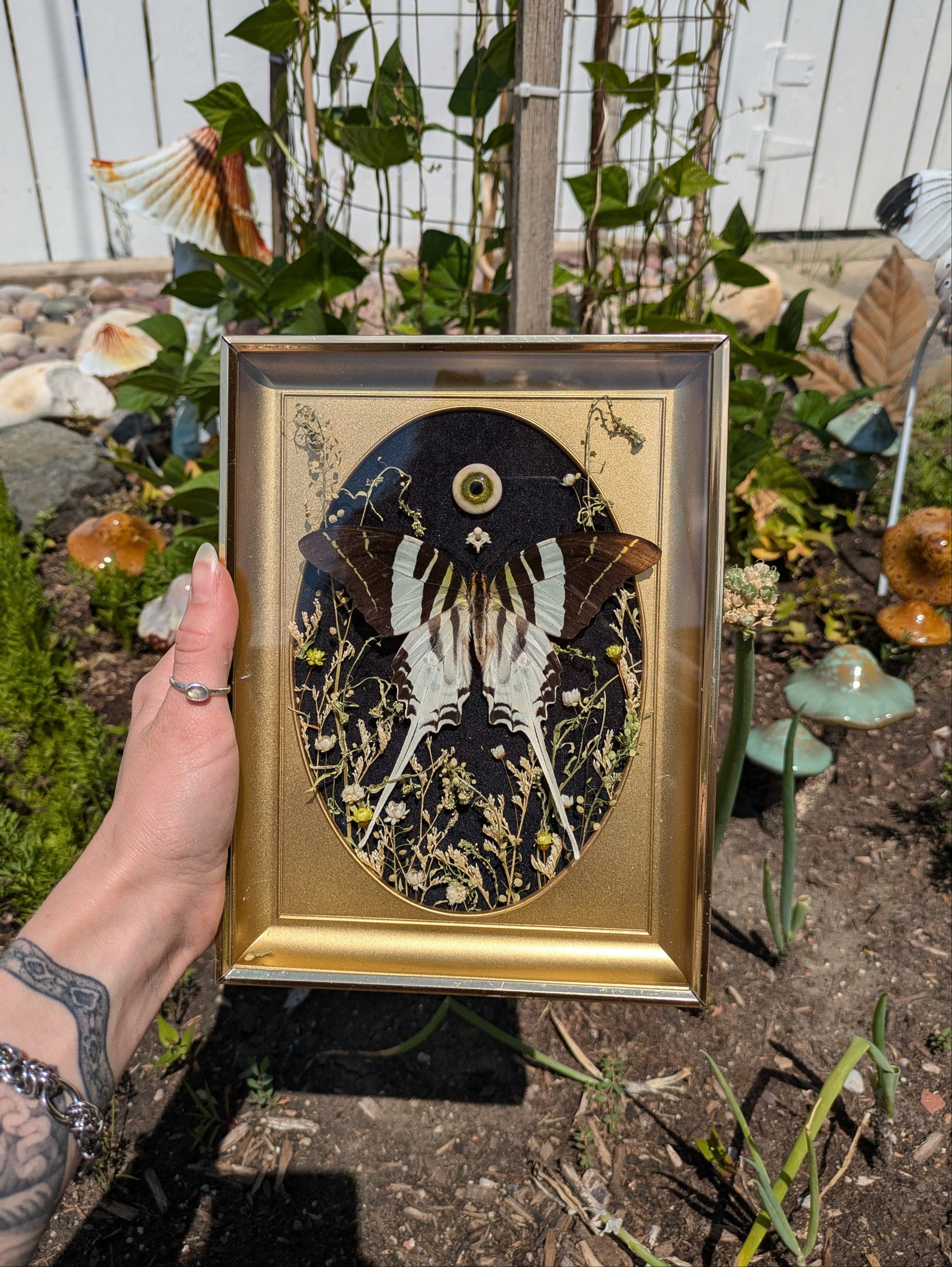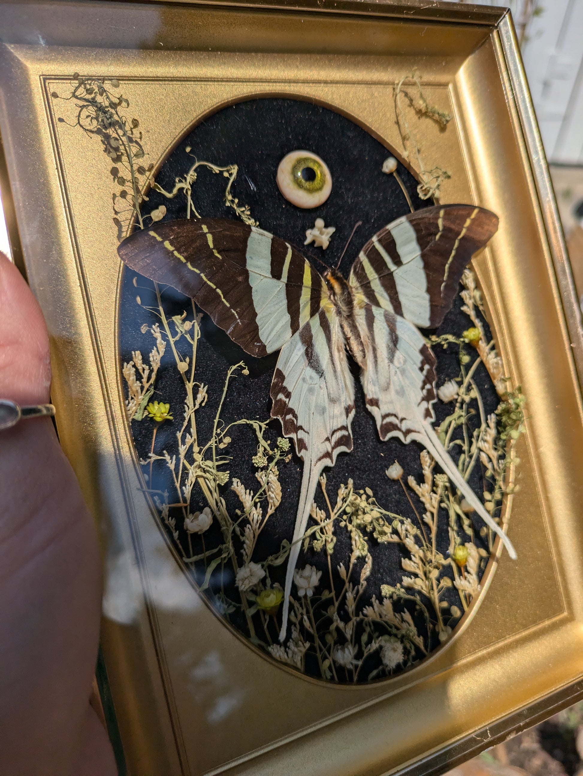 Swallowtail butterfly, dried flowers, snake vertebrae, and a handmade polymer clay eye with a black onyx pupil. All in a vintage brass frame.