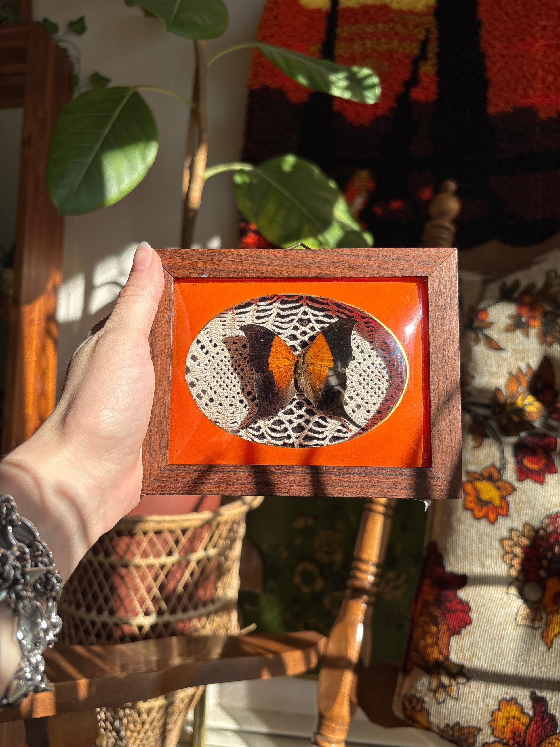 Add a little nature to any space with this butterfly resting on a thrifted doiley background in a vintage MCM orange and wood bubble frame.