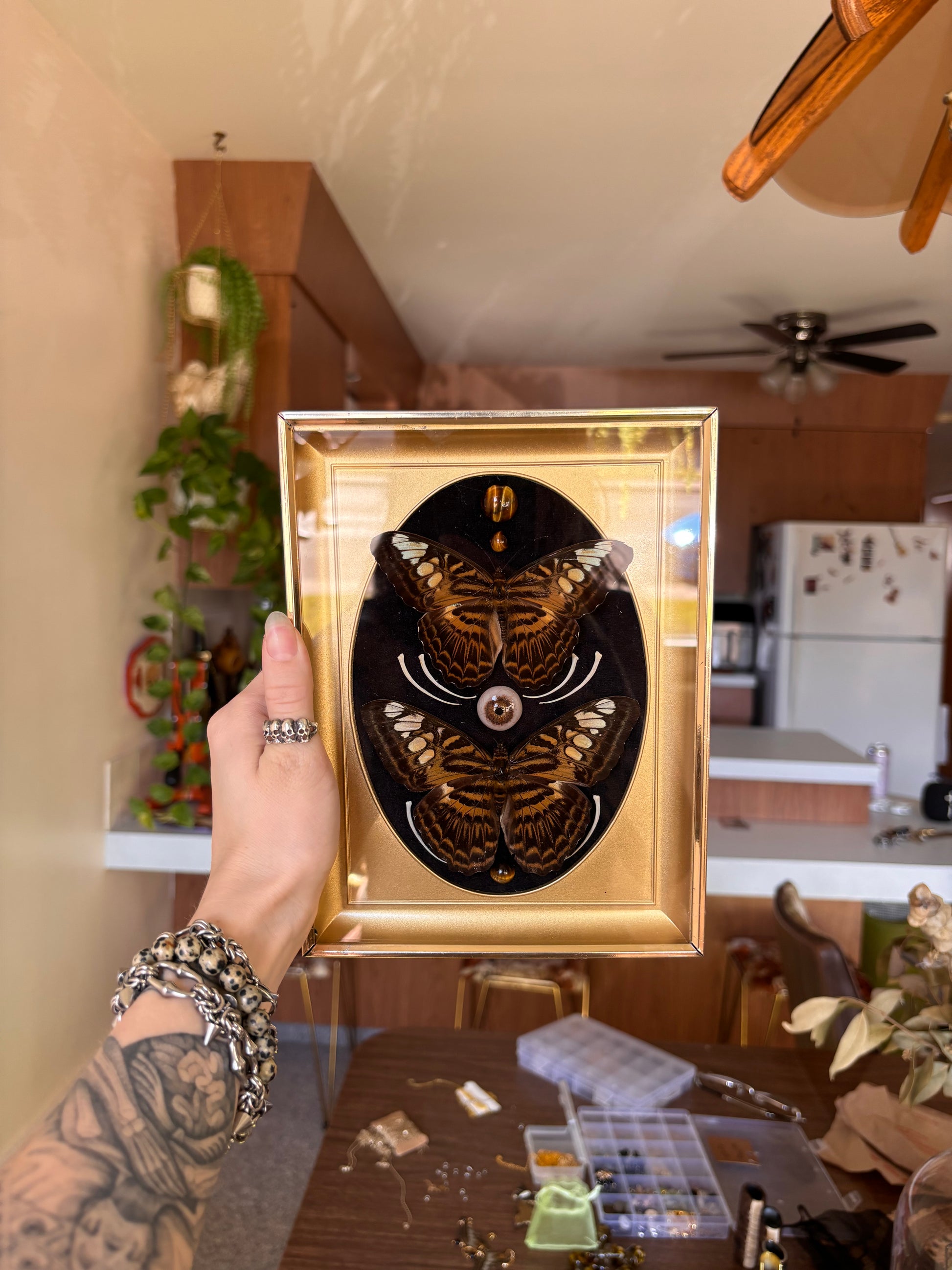 Two clipper butterflies, tigers eye crystals, hand sculpted third eye and snake ribs, all housed in brass vintage frame