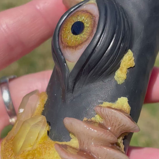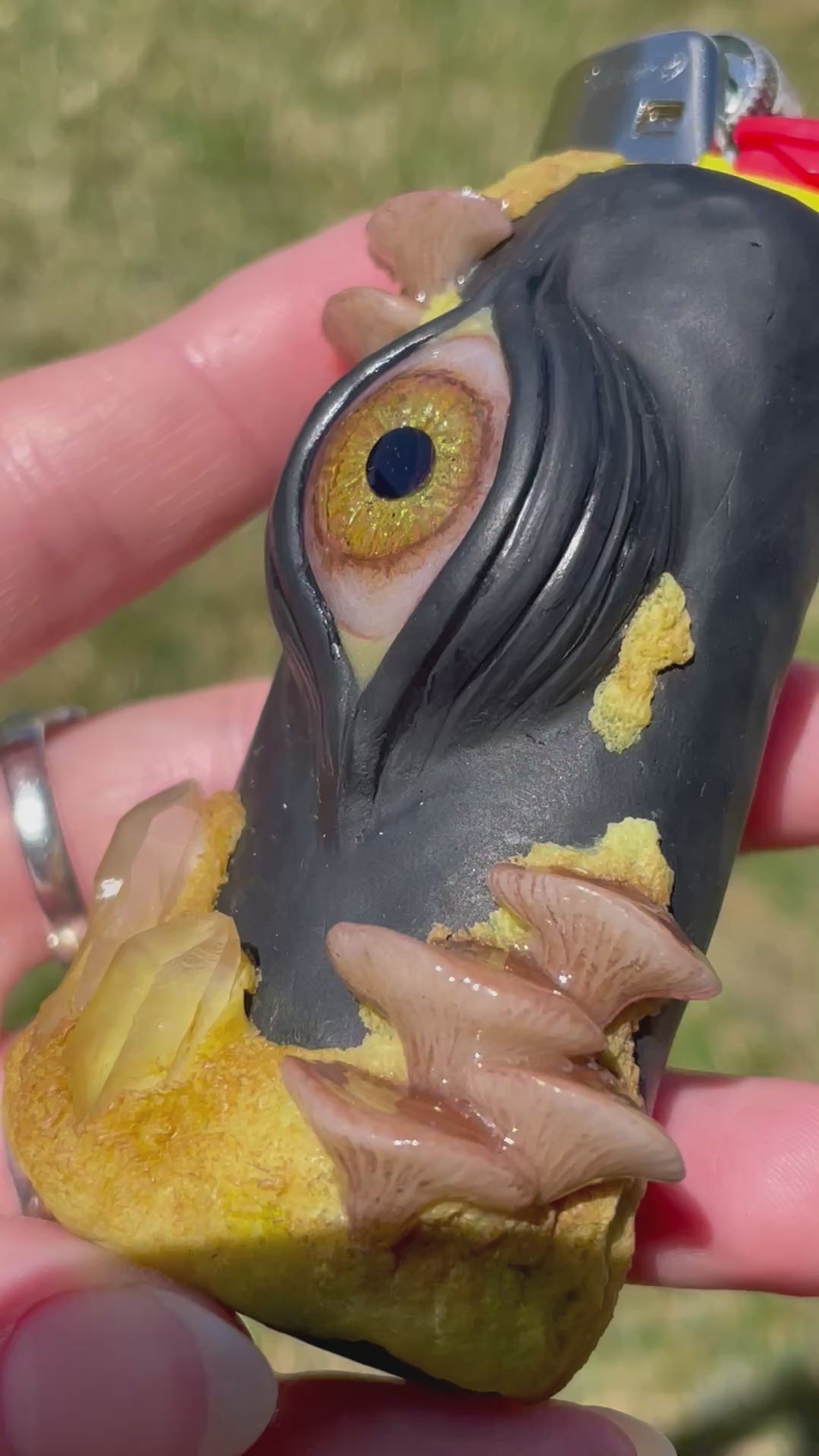 hand-sculpted polymer clay lighter case with glow in the dark mushrooms, moss, clear quartz crystals, an all seeing third eye with a hand-painted iris and a black onyx pupil. Have the magic of the forest in your hands!!!!