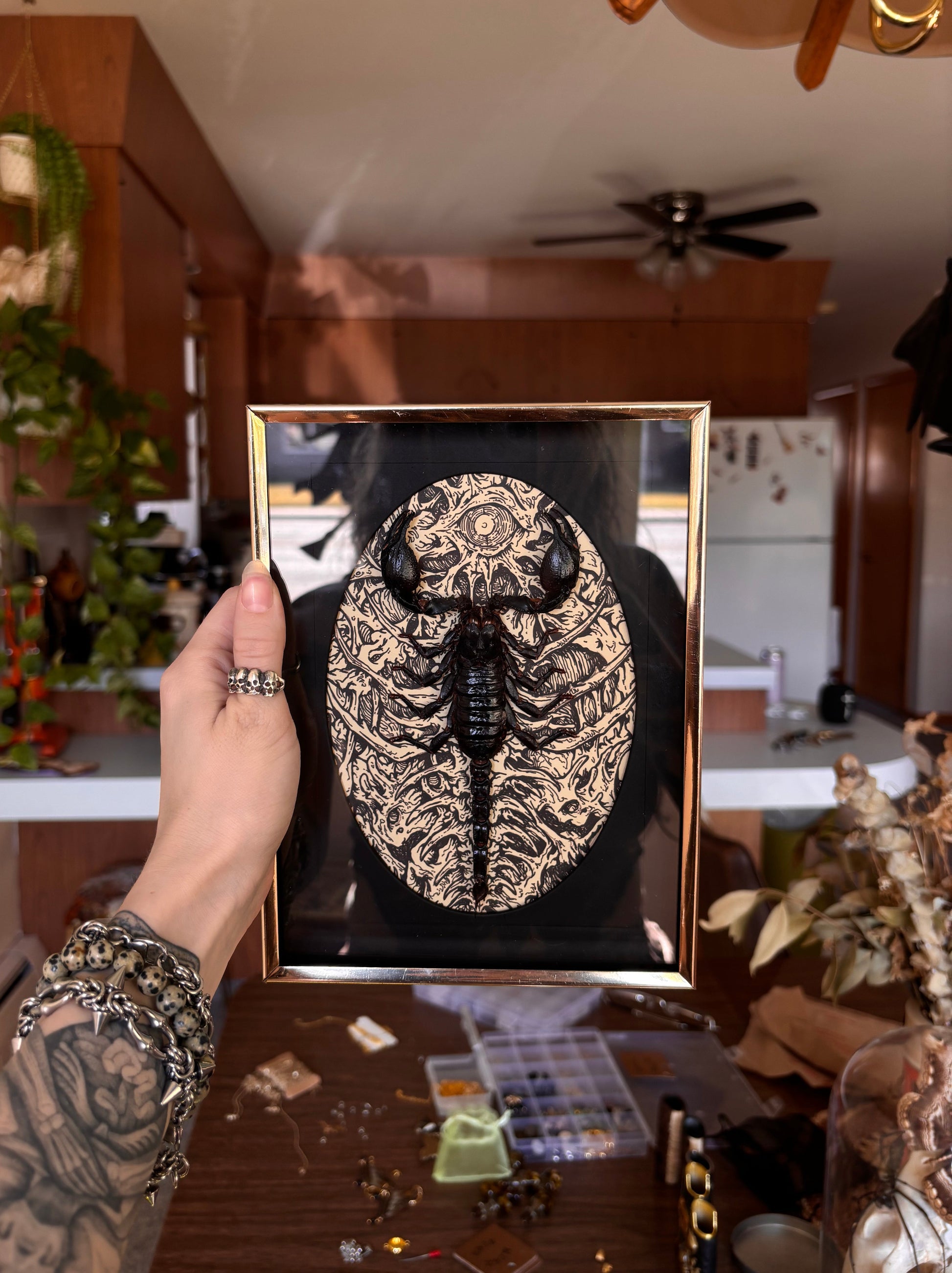 Part of a limited collab series between myself and GhostShipArt! Emperor Scorpion resting on a gnarly illustrated background, housed in brass vintage frame