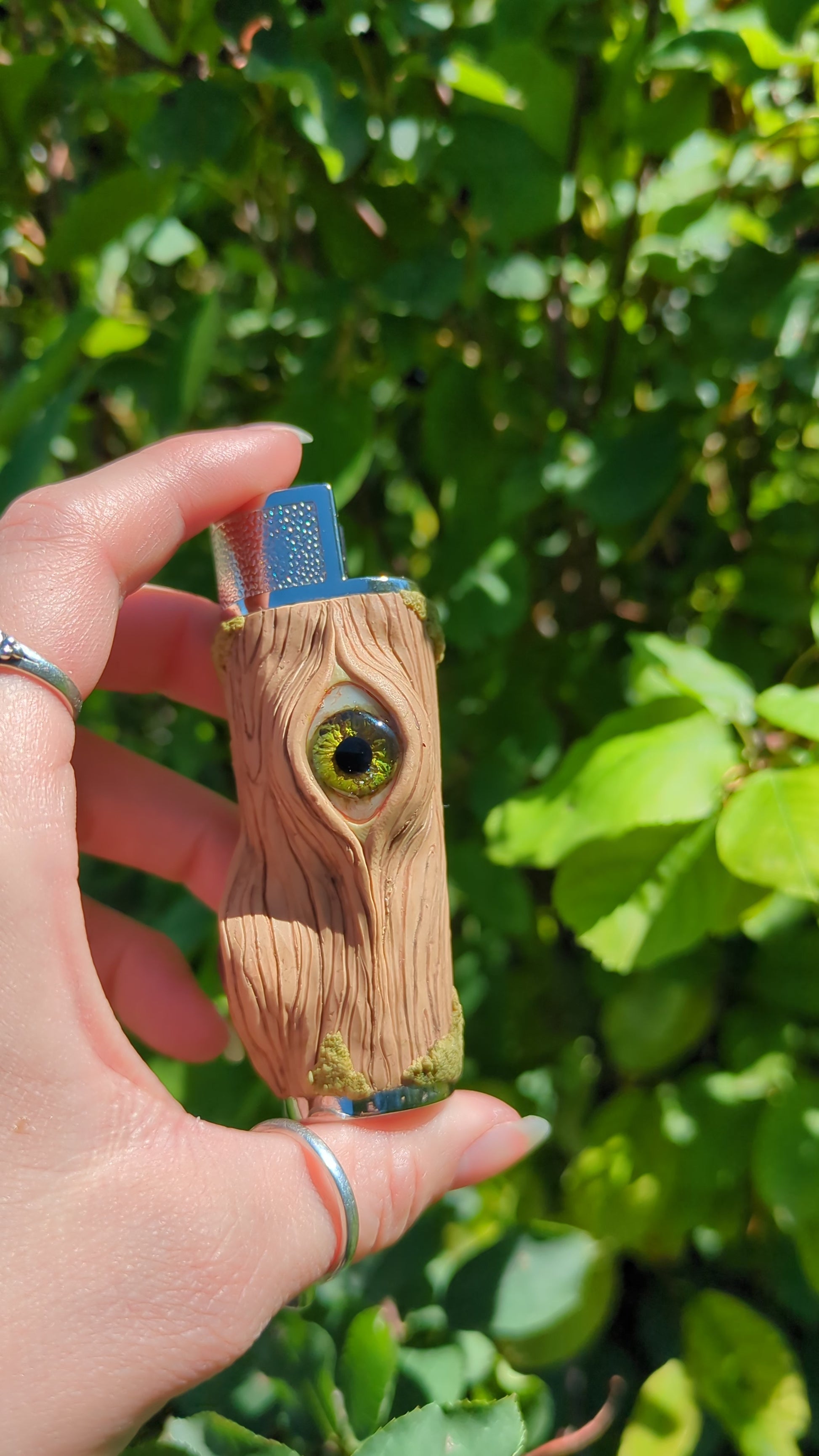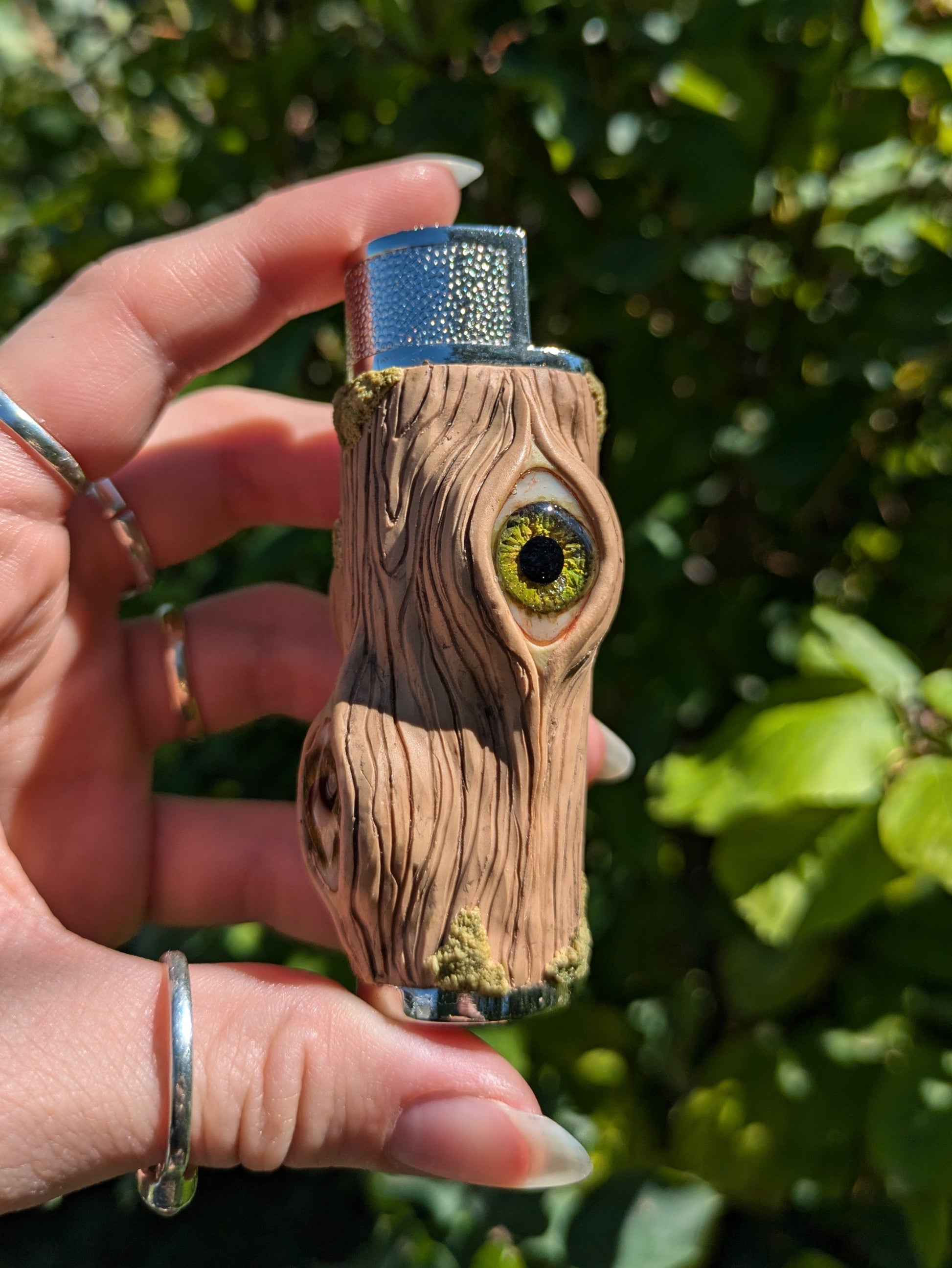 Hand-sculpted polymer clay lighter case with moss and three all seeing eyes peering out from within the grain. Hand-painted iris and a black onyx pupils. Have the magic of the forest in your hands. Sculpted on a sturdy metal clipper lighter case